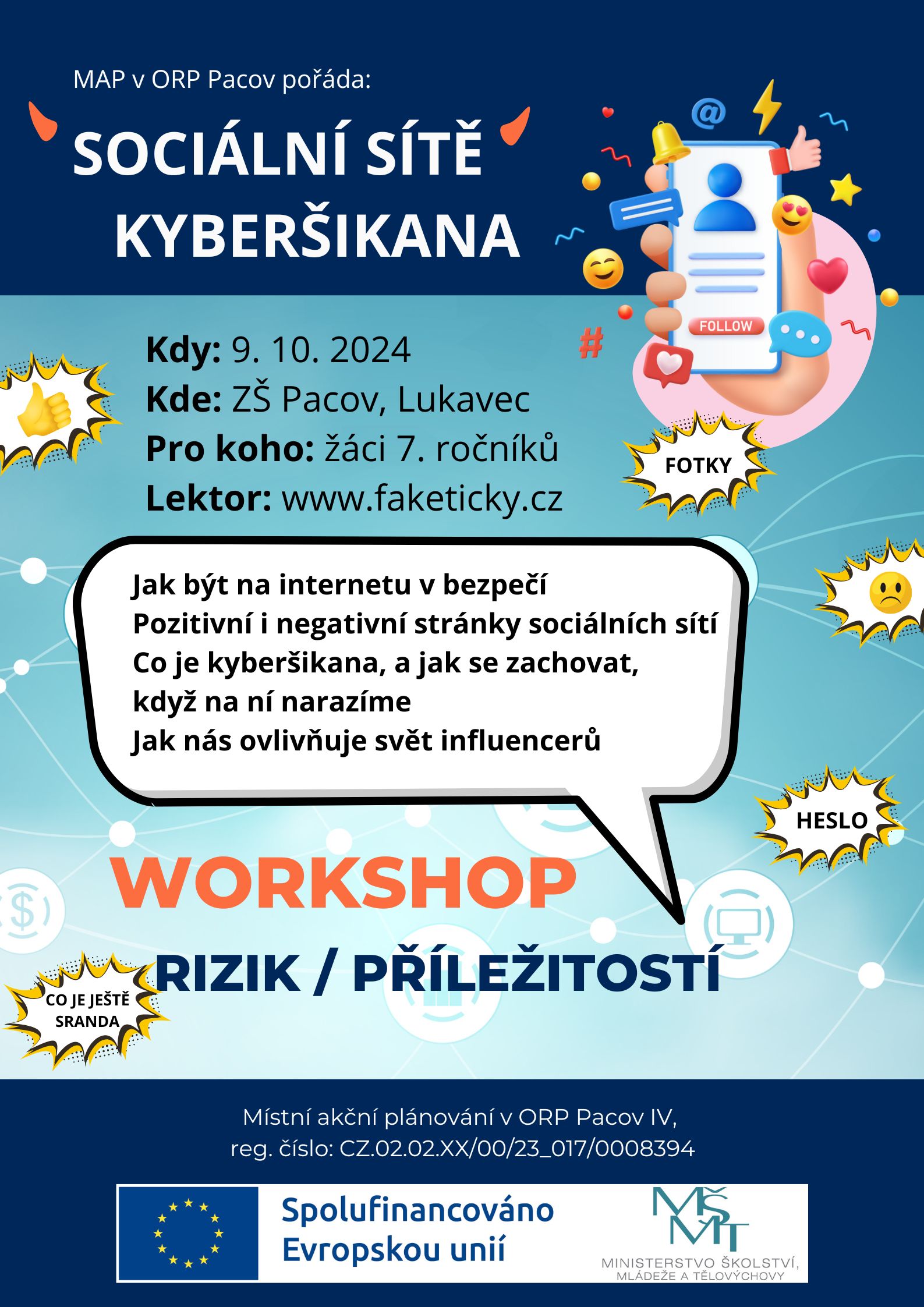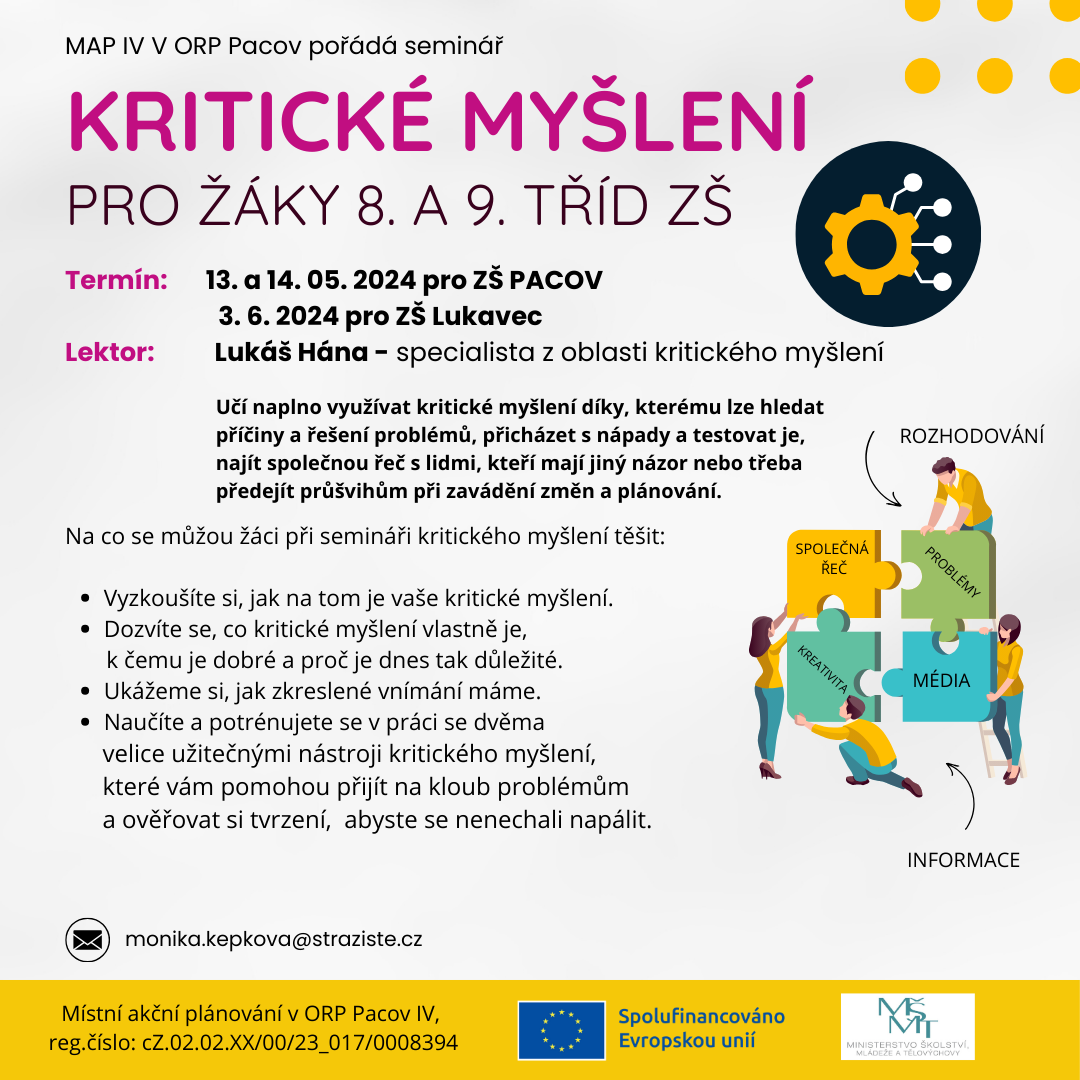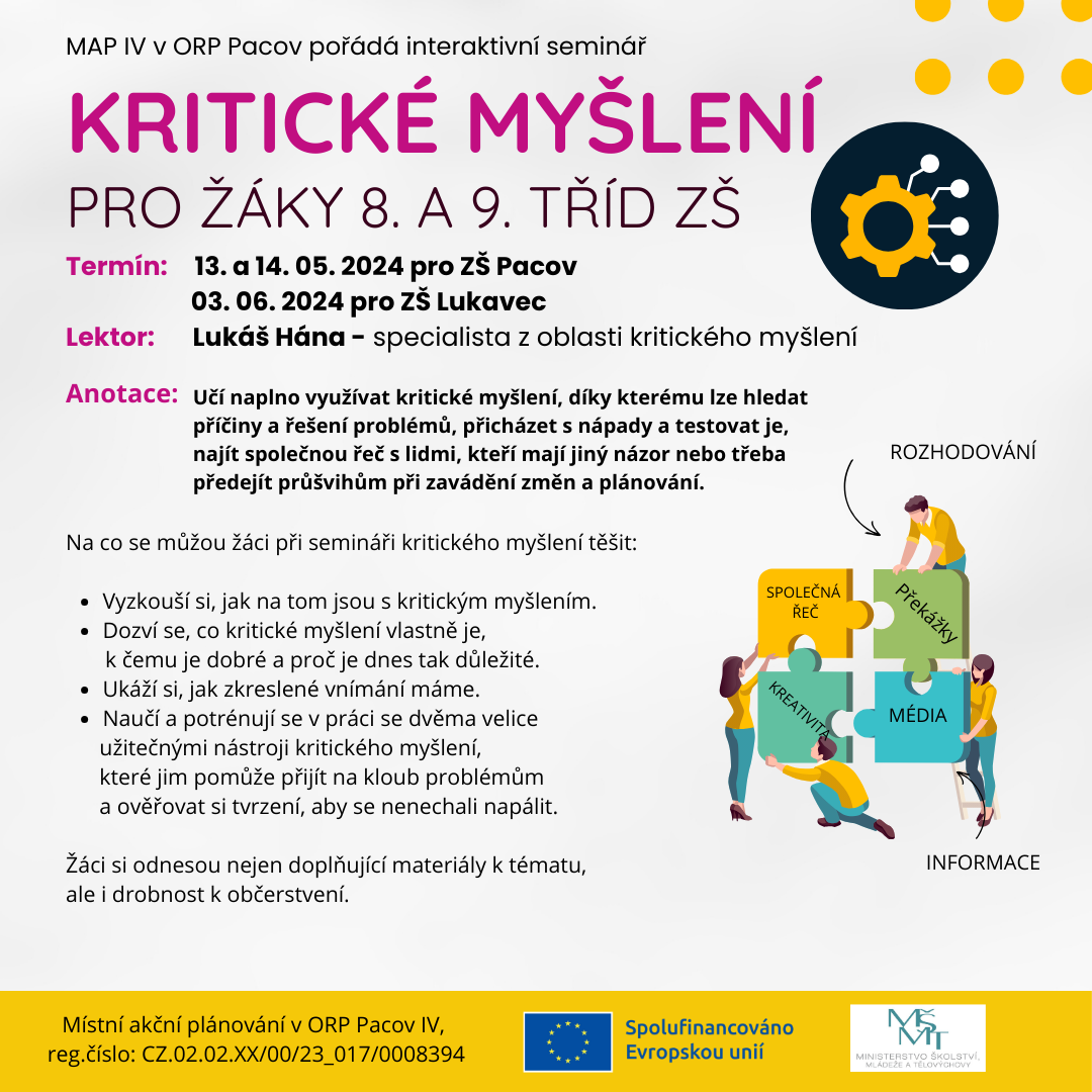 KRITICKÉ MYŠLENÍ / workshop pro žáky ZŠ 8. ročníků, v Zámeckém sále v Pacově, rozděleno na 2 bloky od 8.00–12.30 hodin, Lukáš Hána, PLAKÁT