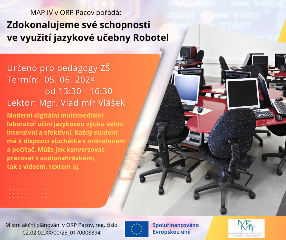DIGITÁLNÍ GRAMOTNOST / školení jazykové učebny Robotel pro pedagogy, ZŠ Pacov, od 15.00 – 18.30 hodin, Mgr. Vladimír Vlášek, PLAKÁT