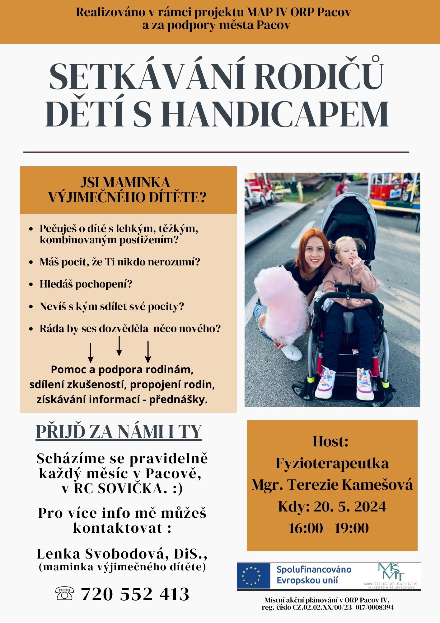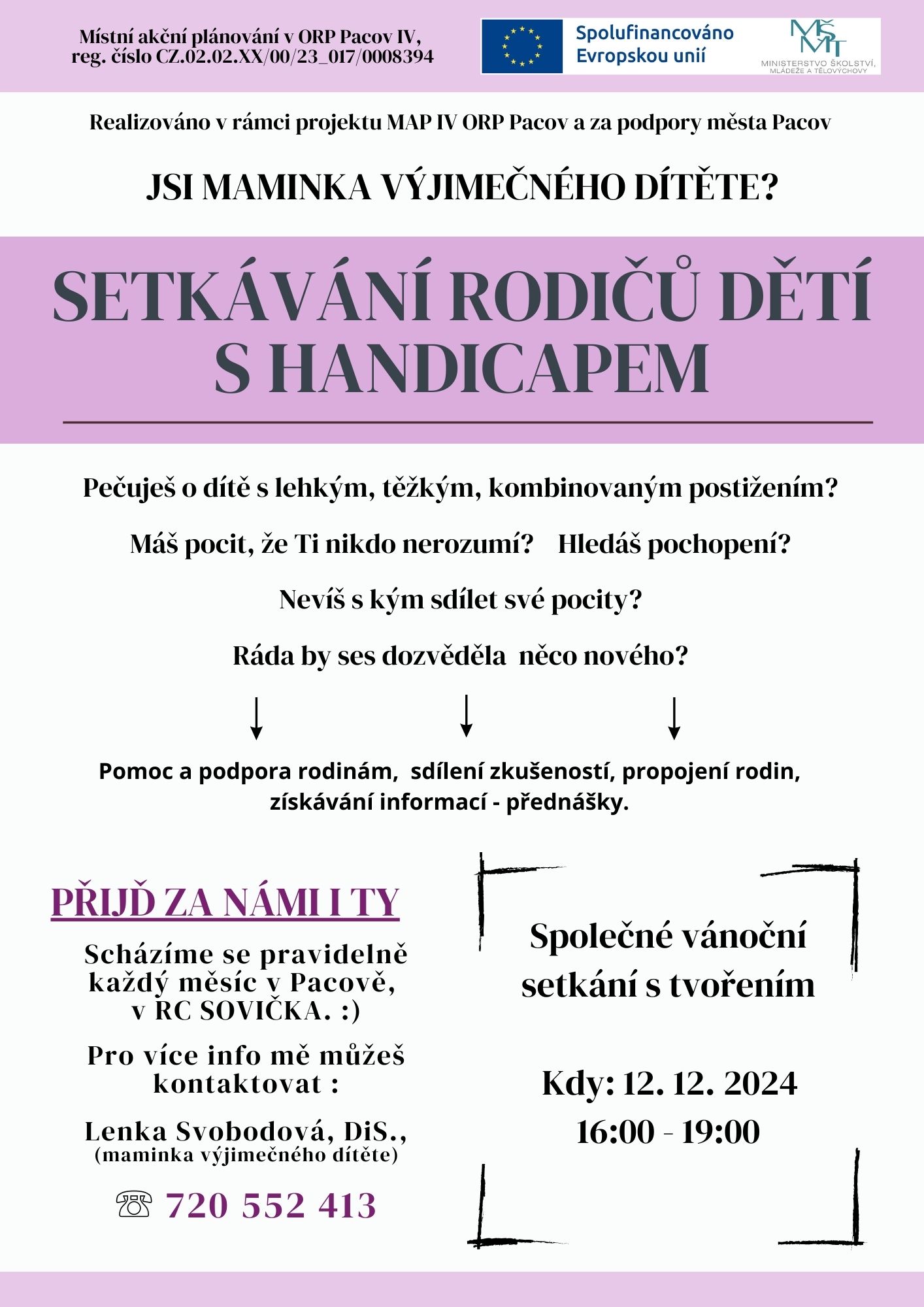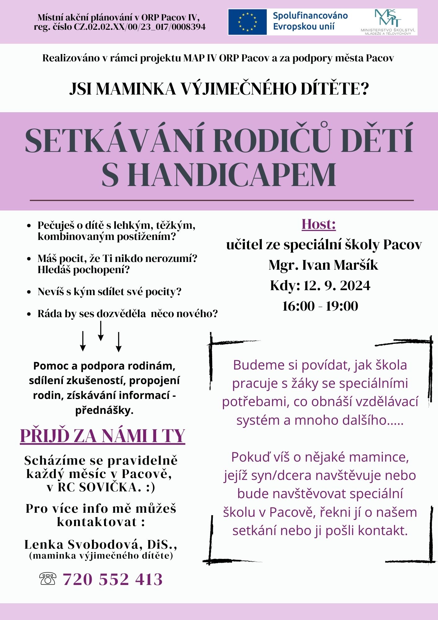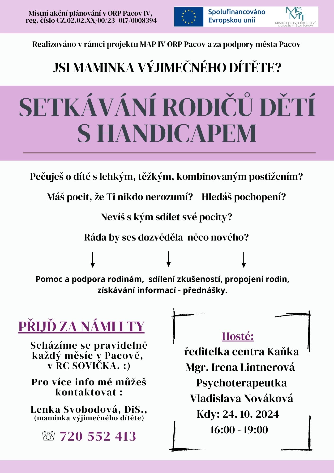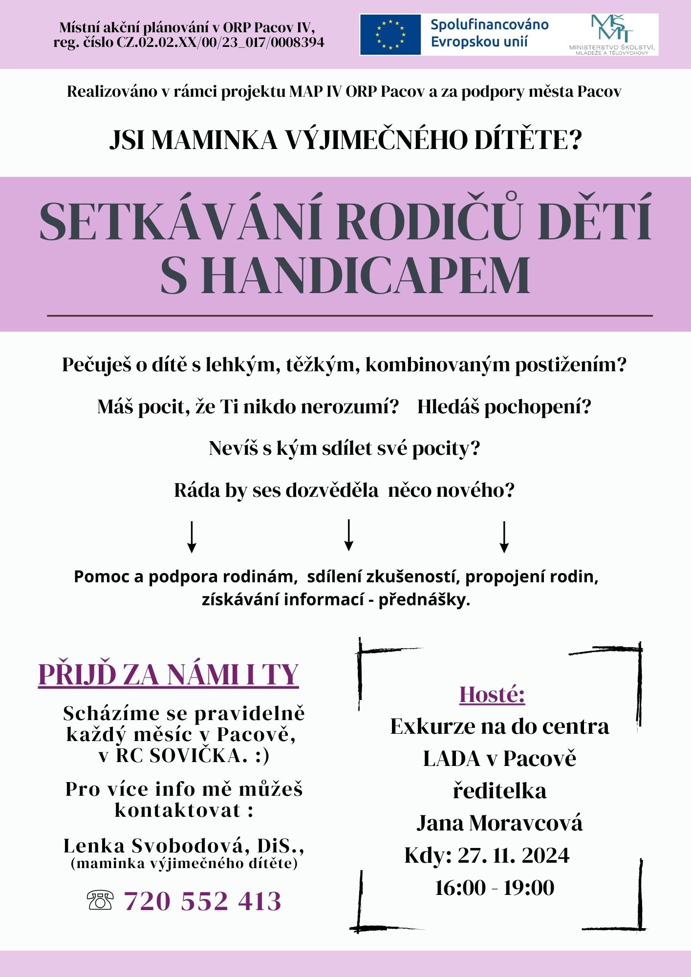 AKCE PRO RODIČE, pravidelné setkávání rodičů dětí s handicapem z ORP Pacov, v RC Sovička Pacov, od 15.00 hodin, PLAKÁT