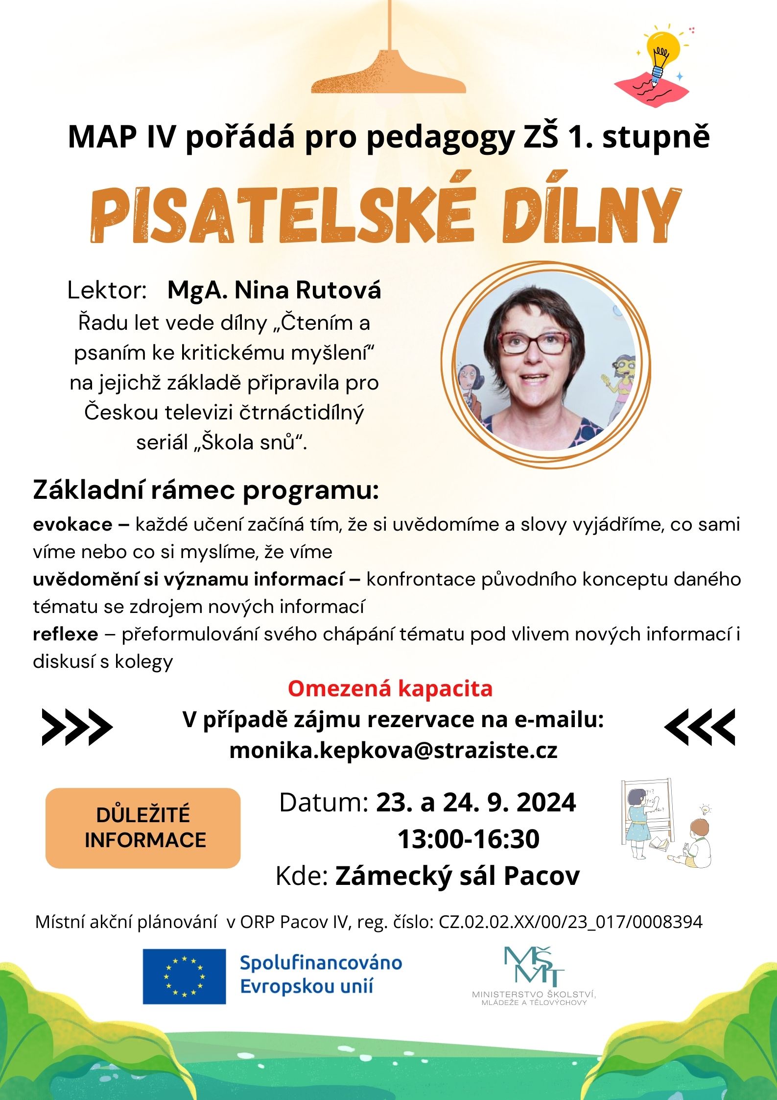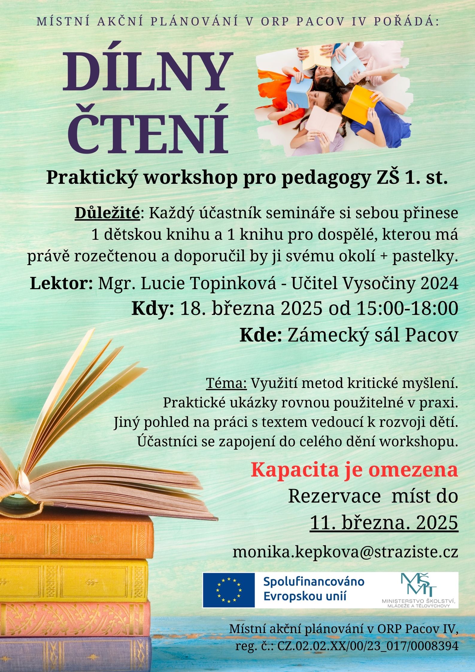 DÍLNY ČTENÍ / Seminář pro pedagogy ZŠ, Zámecký sál Pacov, od 15.00 do 18.00, Mgr. Lucie Topinková, PLAKÁT