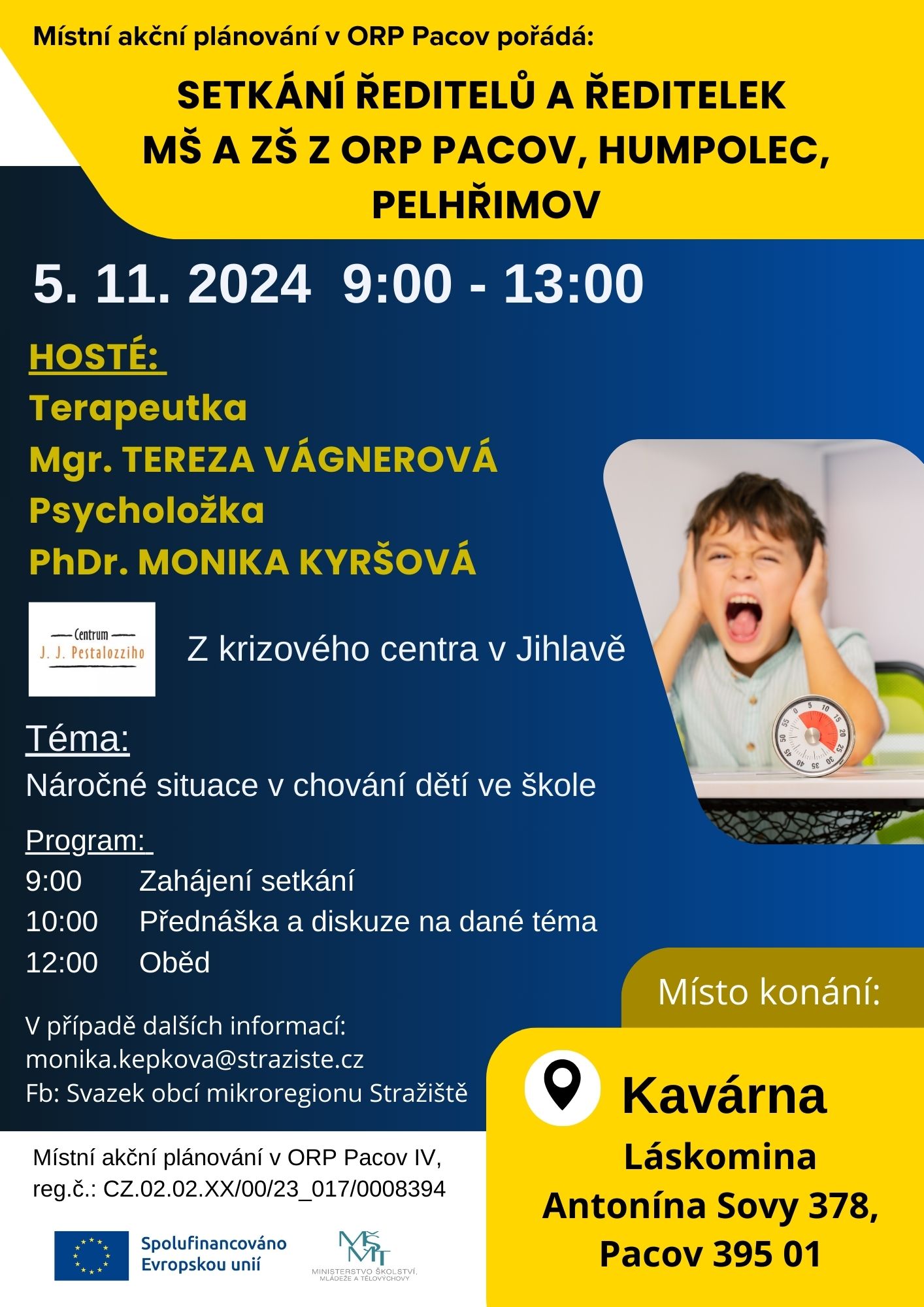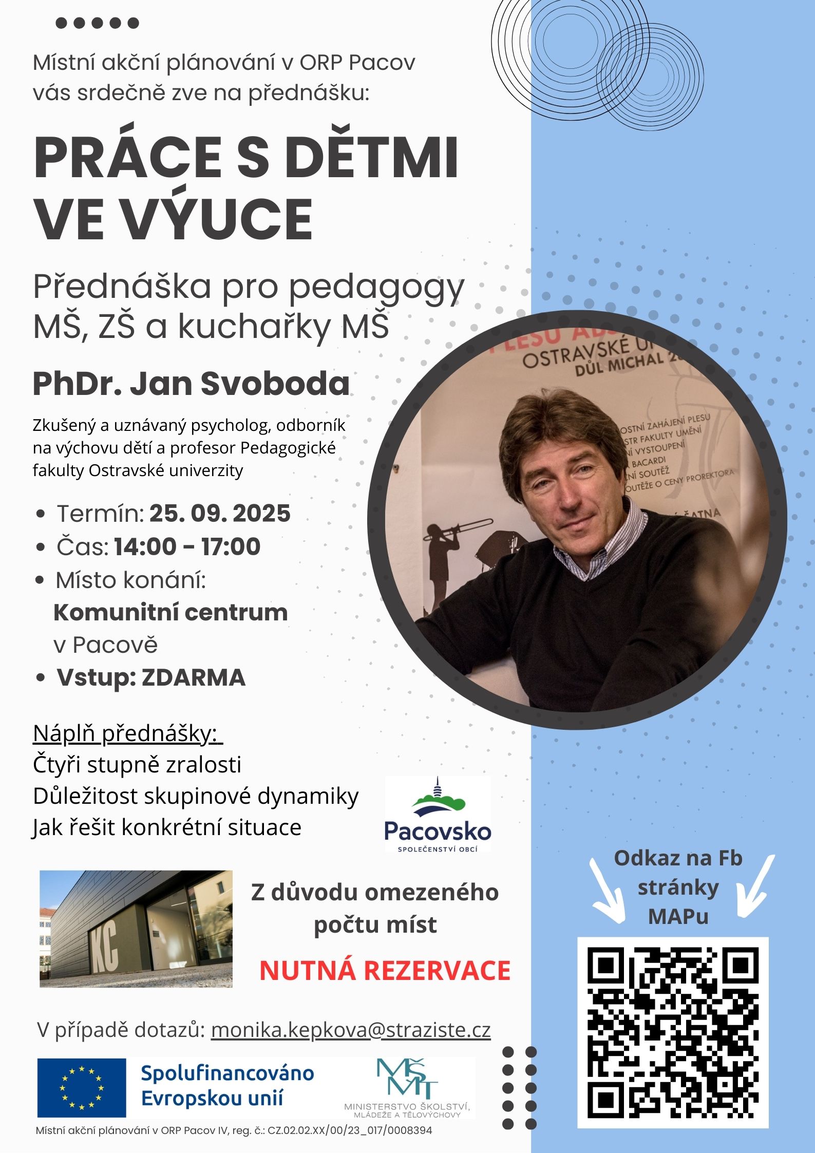 PŘEDNÁŠKA / pro pedagogy ZŠ, MŠ a kuchařky MŠ, PhDr. JAN SVOBODA/ téma: Práce s dětmi ve výuce, od 14.00 hod do 17.00 hod, v Komunitním centru (KC) v Pacově, PLAKÁT