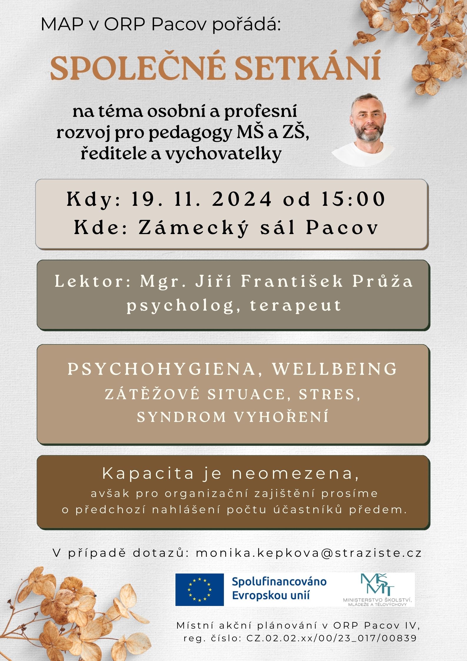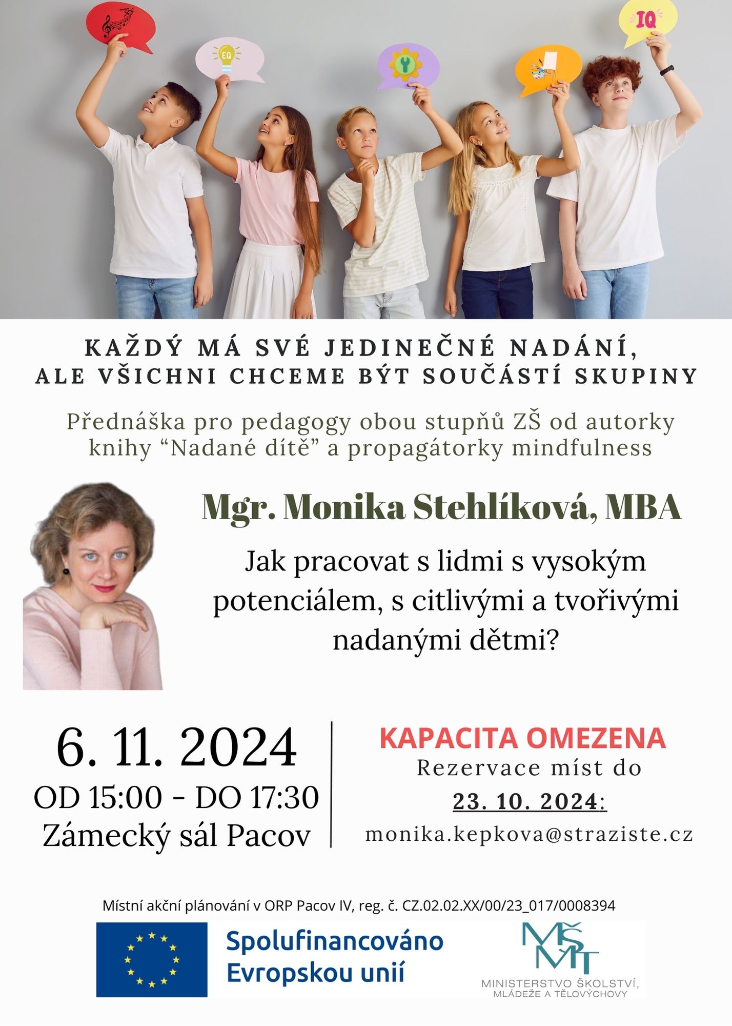 PŘEDNÁŠKA Mgr. Monika Nevolová / seminář určený pro všechny členy vzdělávacího systému v rámci osobní hygieny a osobního růstu, od 15.00 hod do 18.00 hod v Zámeckém sále Pacov