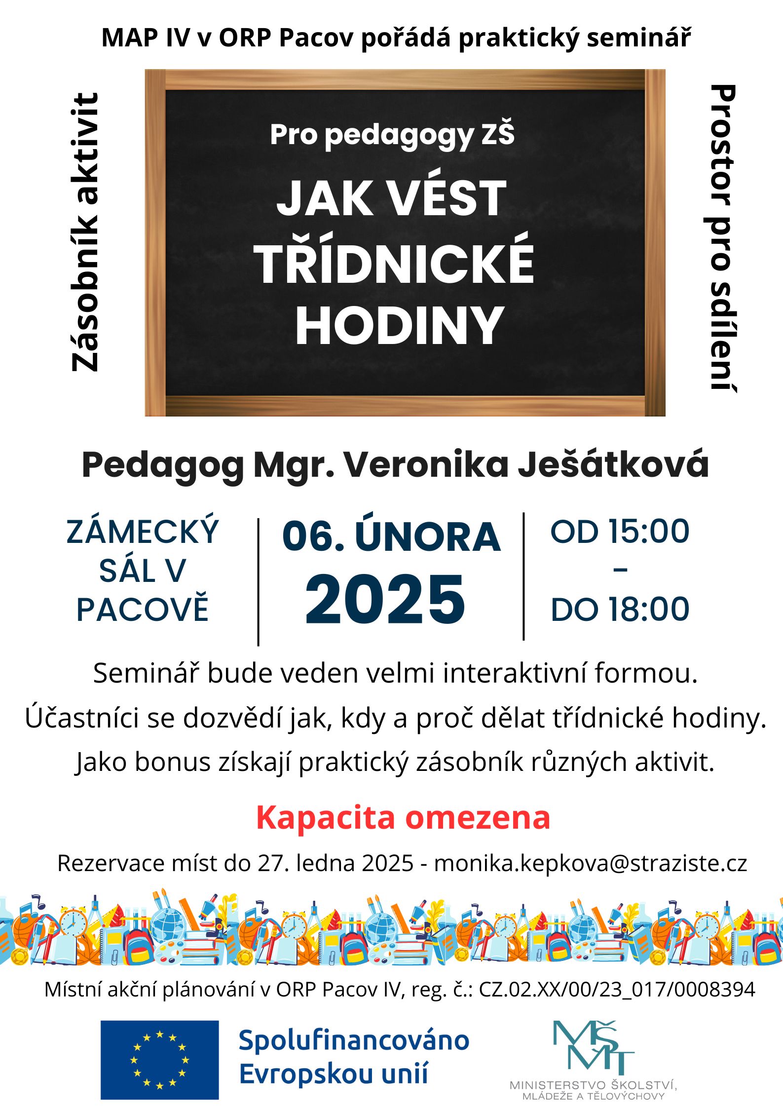 MANAGEMENT TŘÍDNICKÝCH HODIN / Seminář na podporu třídního klimatu pro pedagogy ZŠ, Zámecký sál Pacov, od 15.00 h do 18.00h, Mgr. Veronika Ješátková, PLAKÁT