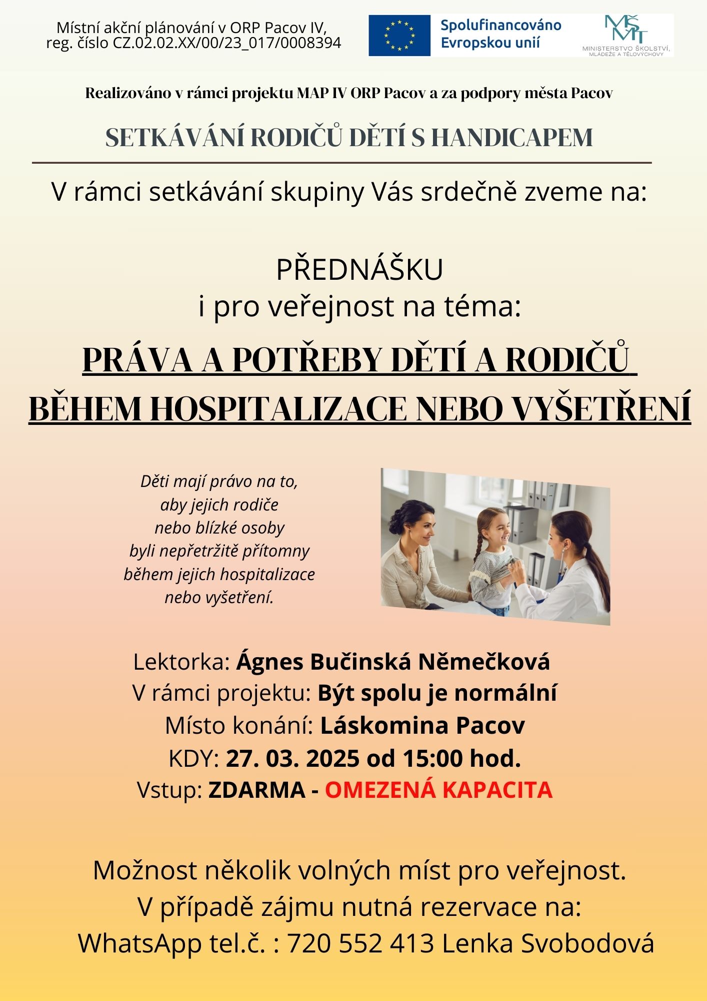 AKCE PRO RODIČE / Pravidelné setkávání rodičů dětí s handicapem z ORP Pacov, Láskomina Pacov, od 15.00 hodin, PLAKÁT