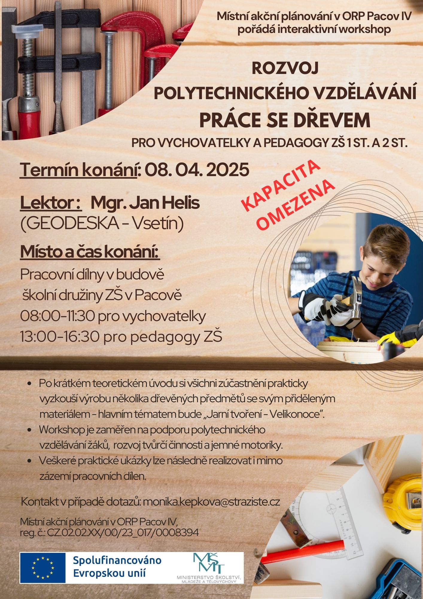 PRÁCE SE DŘEVEM / Praktický workshop na podporu polytechnického vzdělávání pro pedagogy ZŠ a vychovatelky, od 8.00 hod ZŠ Pacov, Za Branou, Geodeska Mgr. Jan Helis, PLAKÁT