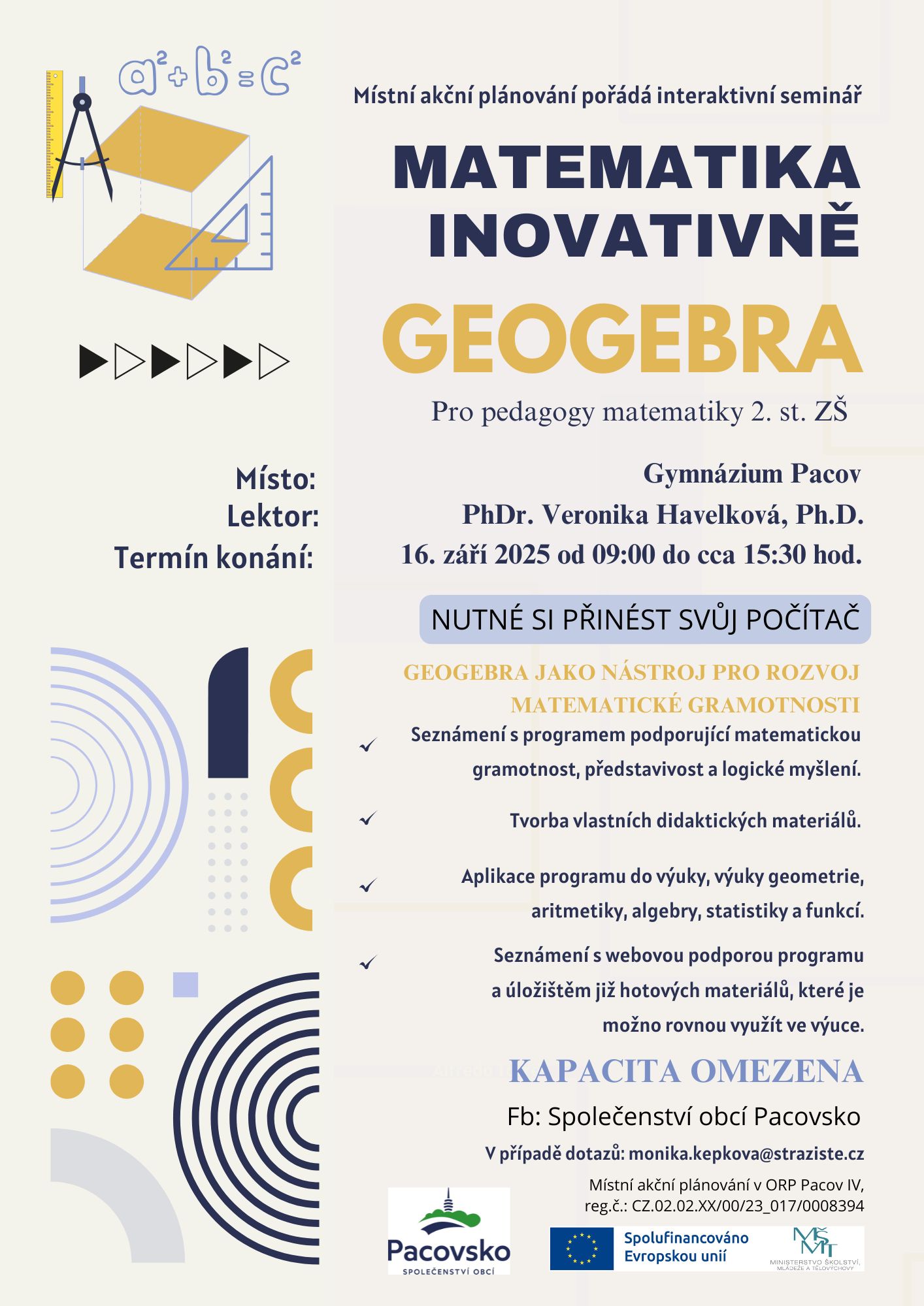 GEOGEBRA / Praktický workshop pro pedagogy matematiky 2. st. ZŠ, Gymnázium Pacov, od 9.00 hod do 15.30 hod, spoluzakladatelka programu PhDr. Veronika Havelková, Ph.D., PLAKÁT