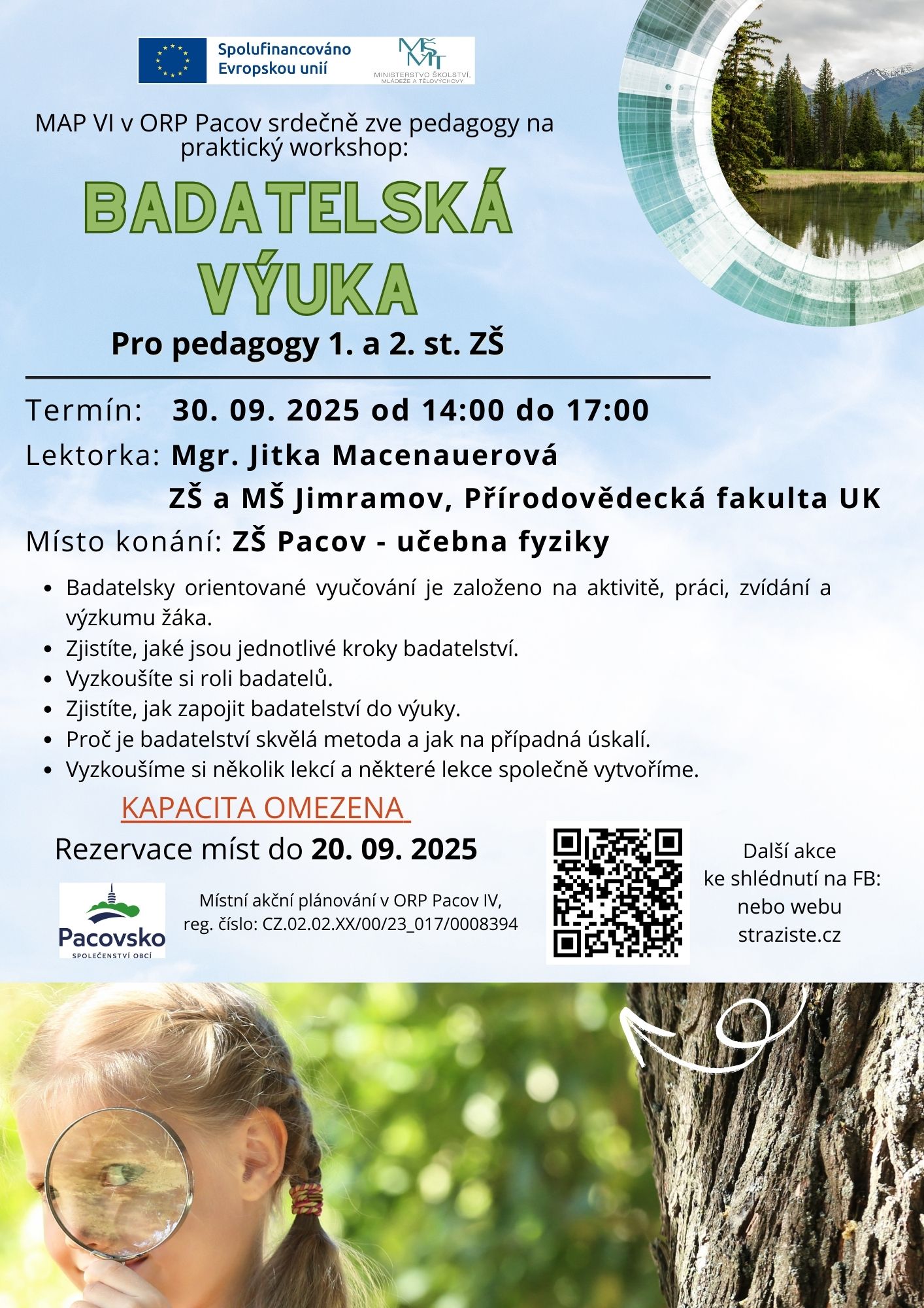 BADATELSKÁ VÝUKA / pro pedagogy 1. i 2. st. ZŠ, pod vedením Mgr. Jitky Macenauerové, od 14.00 hod do 17.00 hod, ZŠ Pacov, Za Branou, PLAKÁT