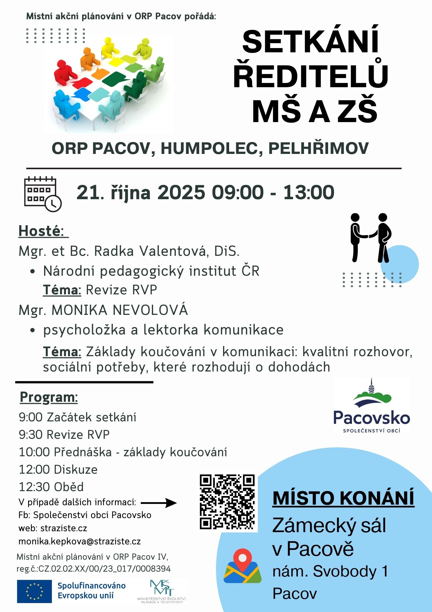 SETKÁNÍ ŘEDITELŮ MŠ A ZŠ / vzdělávací seminář s Mgr. et Bc. Radkou Valentovou, DiS. a Mgr. Monikou Nevolovou, v Pacově – Zámecký sál, od 9.00 hodin, PLAKÁT