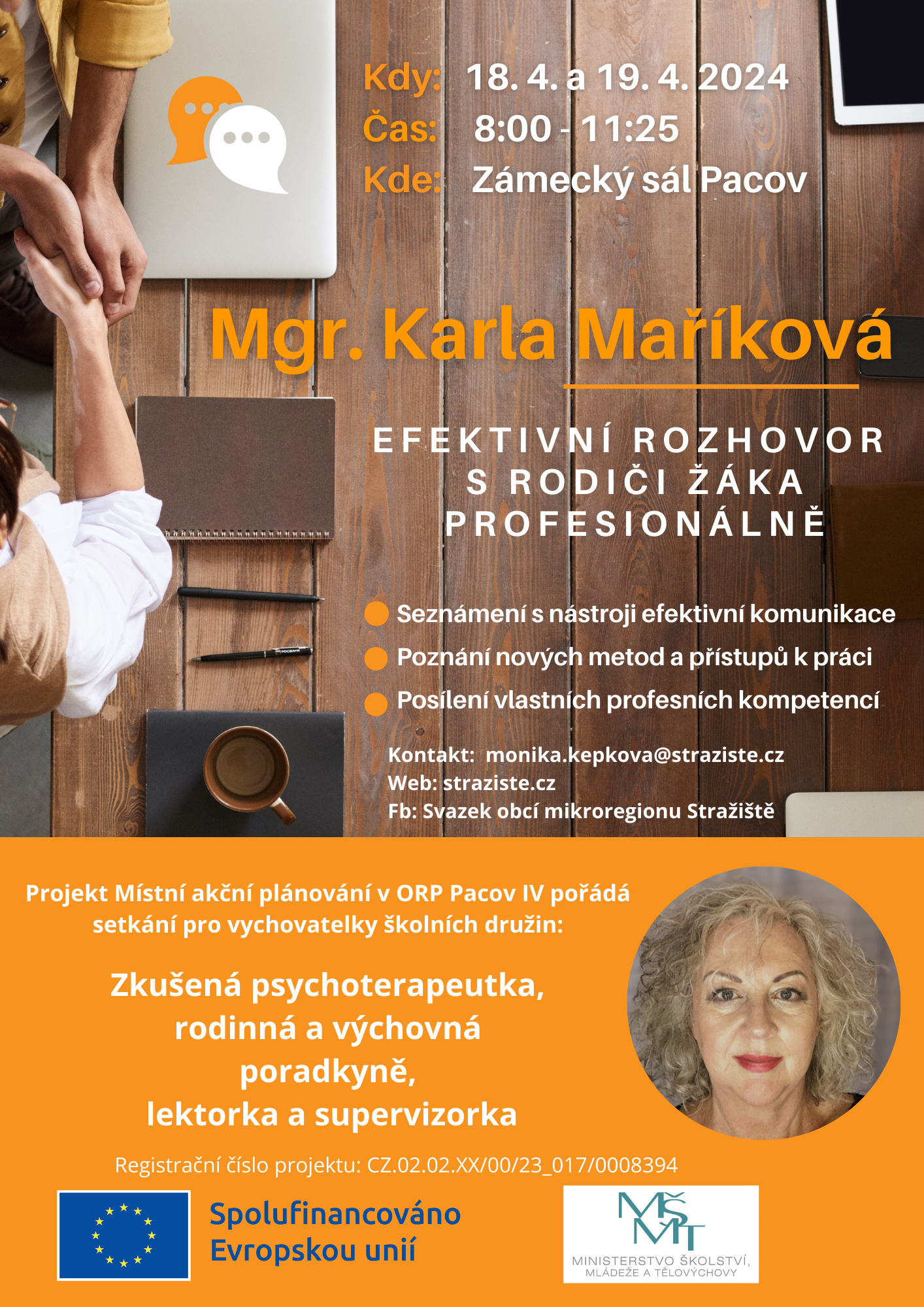 EFEKTIVNÍ SPOLUPRÁCE / pokračování v setkání pro vychovatelky školních družin, v Zámeckém sále v Pacově, od 8.00–11.30 hodin, Mgr. Karla Maříková