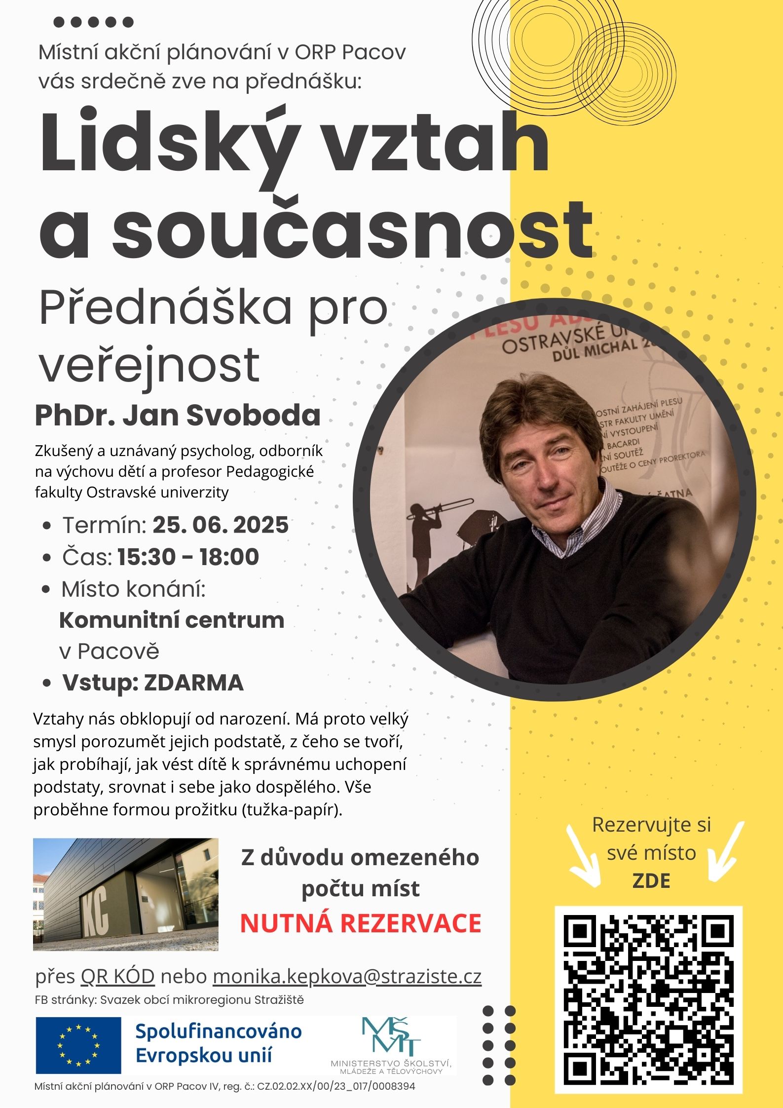 PŘEDNÁŠKA PRO VEŘEJNOST PhDr. JAN SVOBODA/ téma: Lidský vztah a současnost, od 15.30 hod, vstup zdarma, v Komunitním centru (KC) v Pacově, PLAKÁT